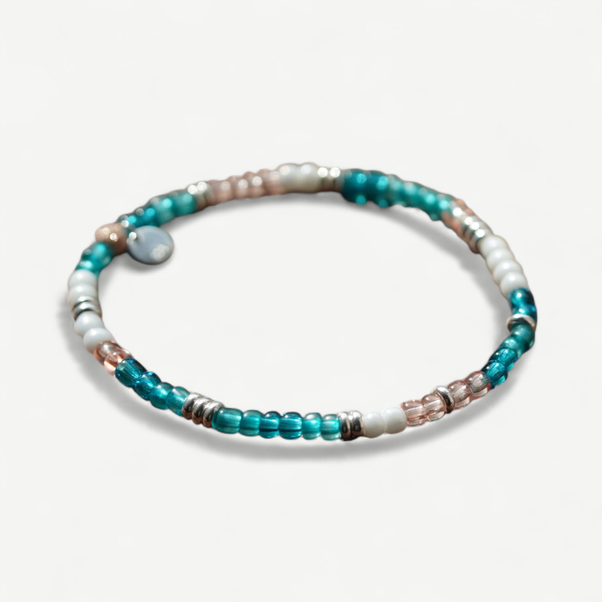 Dieses handgefertigte Armband vereint Eleganz mit Modernität. Es besteht aus feinen 925er Silber-Rondellen, einer edlen rosévergoldeten Perle sowie sorgfältig ausgewählten Glas-Rocailles in Weiß, Grün und Petrolblau. Das elastische Design sorgt dafür, dass sich das Armband angenehm und flexibel jedem Handgelenk anpasst.