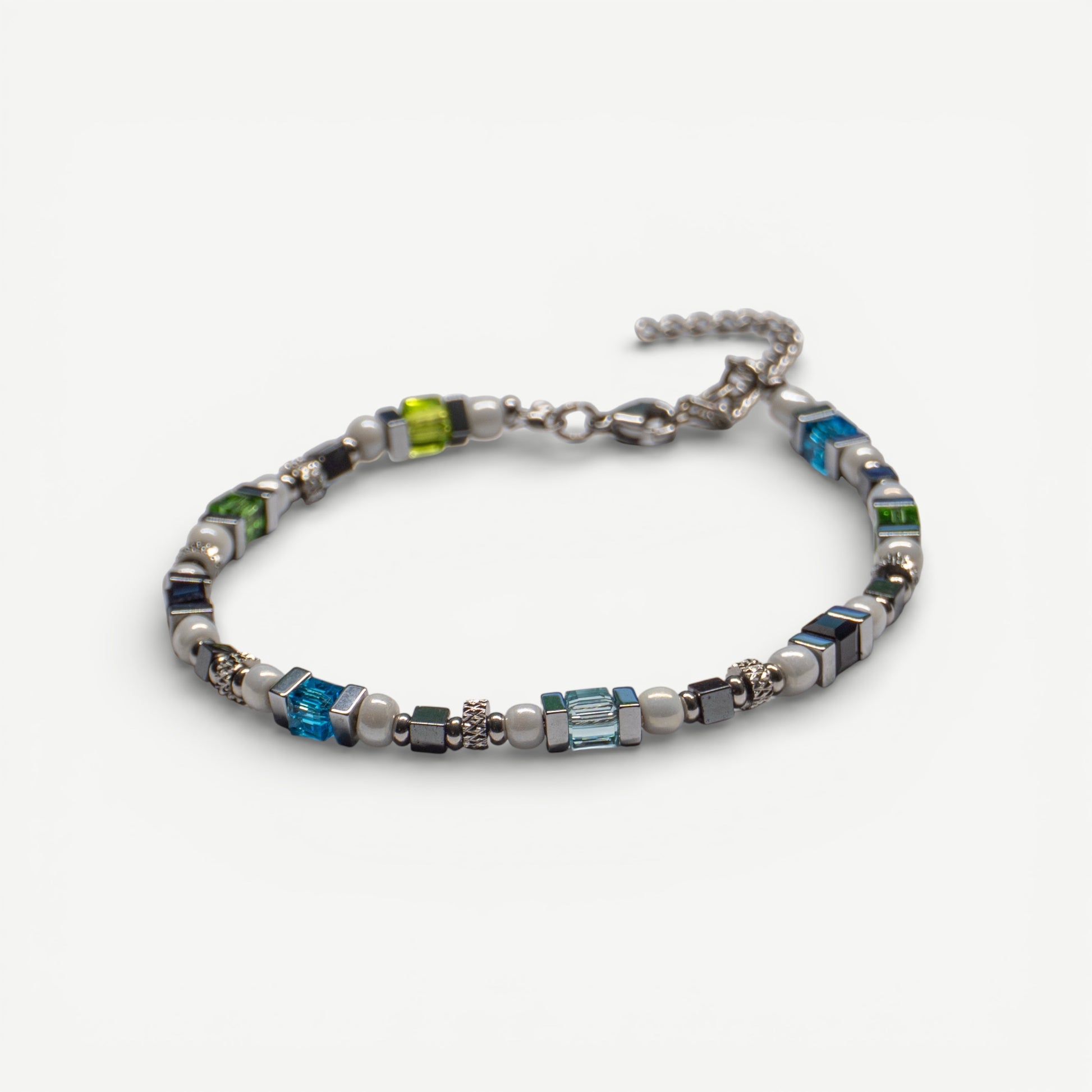 Dieses hochwertige Armband vereint sportliche Eleganz mit robuster Langlebigkeit und ist das perfekte Accessoire für Alltag und besondere Anlässe. Gefertigt aus widerstandsfähigen Edelstahlperlen, edlen synthetischen Hämatitkörnern und bunten, facettierten Glaswürfeln, überzeugt das Design durch seine moderne Optik.